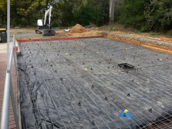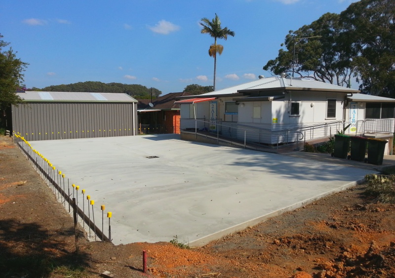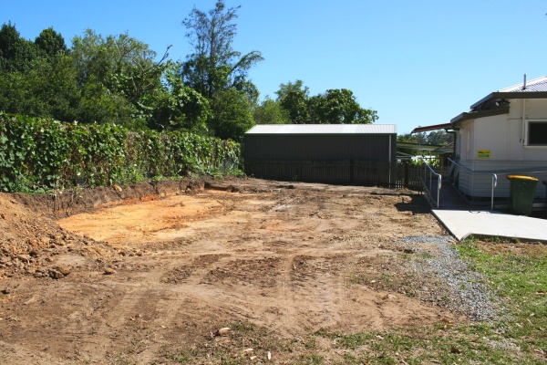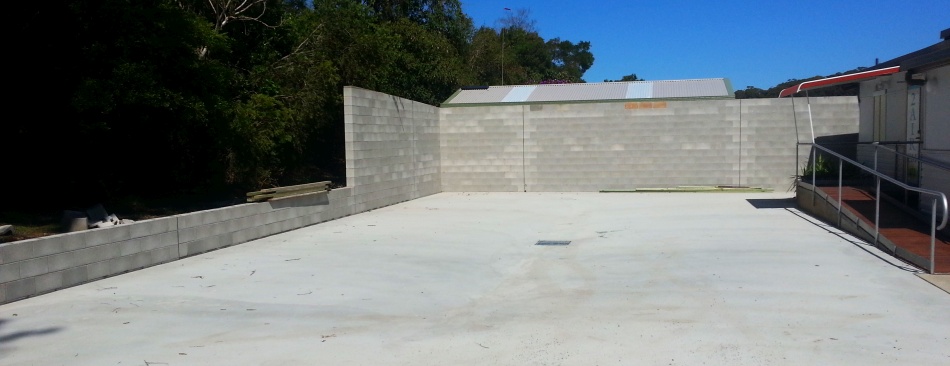 The concrete has now been poured for the back yard parking and recreation area. The next step involves ‘bricking-in’ retaining walls around the eastern and southern sides of the yard.