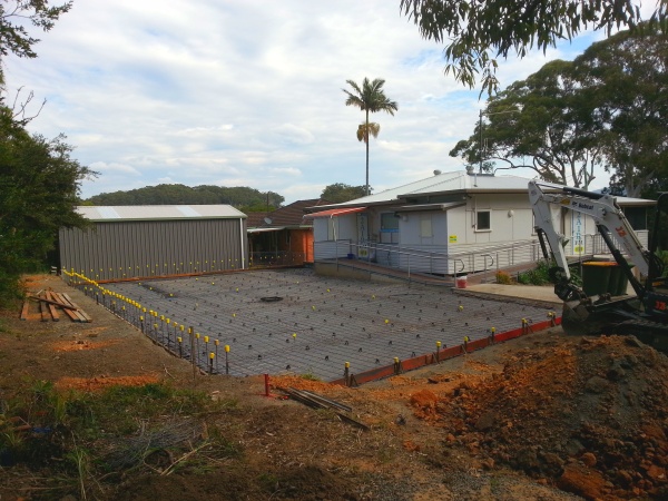 Work has now begun in preparation for concreting the back yard of the premises. The ground has been graded and leveled, with a slight fall towards the centre for drainage. Form-boards are in place, as is the underlay, trench-mesh and slab reinforcement. Concreting of the back yard will provide car parking for those with mobility issues, as well as a recreation area for future social occasions.